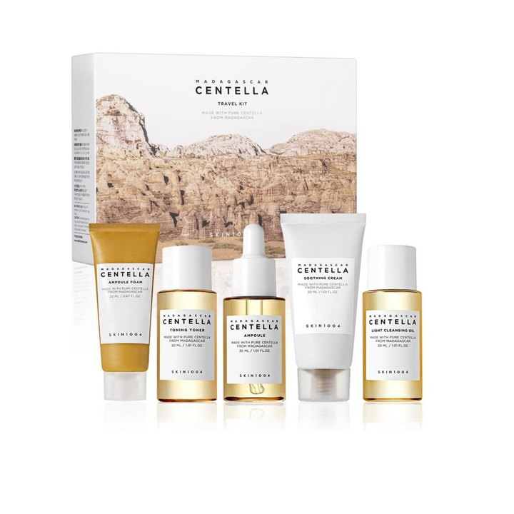 تمثل مجموعة العناية بالبشرة ذات الحجم المناسب للسفر من Skin 1004 مجموعة متنوعة من المنتجات