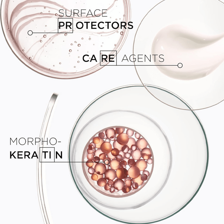 يحتوي على مركب مورفو كيراتين الذي يعيد حيوية الشعر ويسهل تصفيف الشعر وحمايته من التجعد.