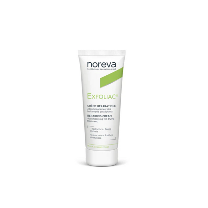 كريم مرطب و مرمم خاص لعلاج حب الشباب الموضعية او الفموية. كريم نوريفا إكسفولياك الترميمي 40 مل يعمل على إصلاح الطبقة الدهنية المائية مع استعادة الحاجز الجلدي وإزالة مشاعر المرتبطة باستخدام العناية التي تستنزف الجلد. يعيد الهيكلة ويلطف ويرطب ويقلل من العلامات.